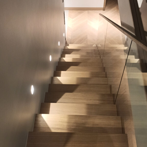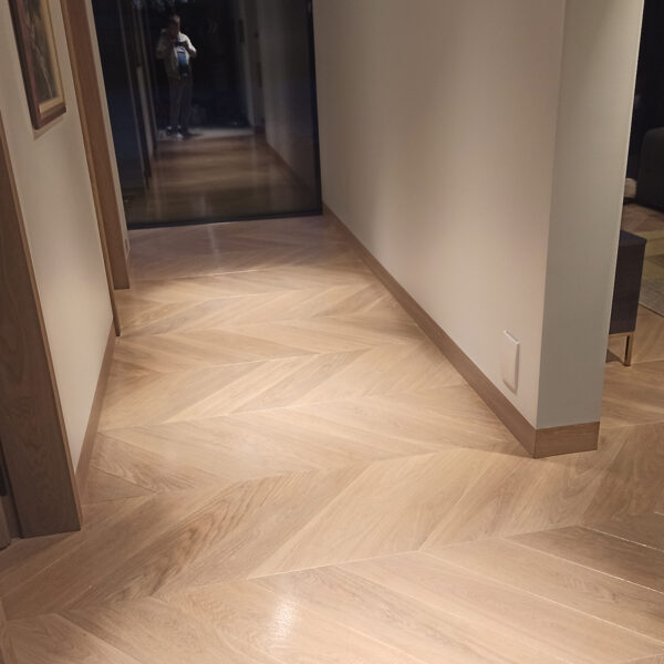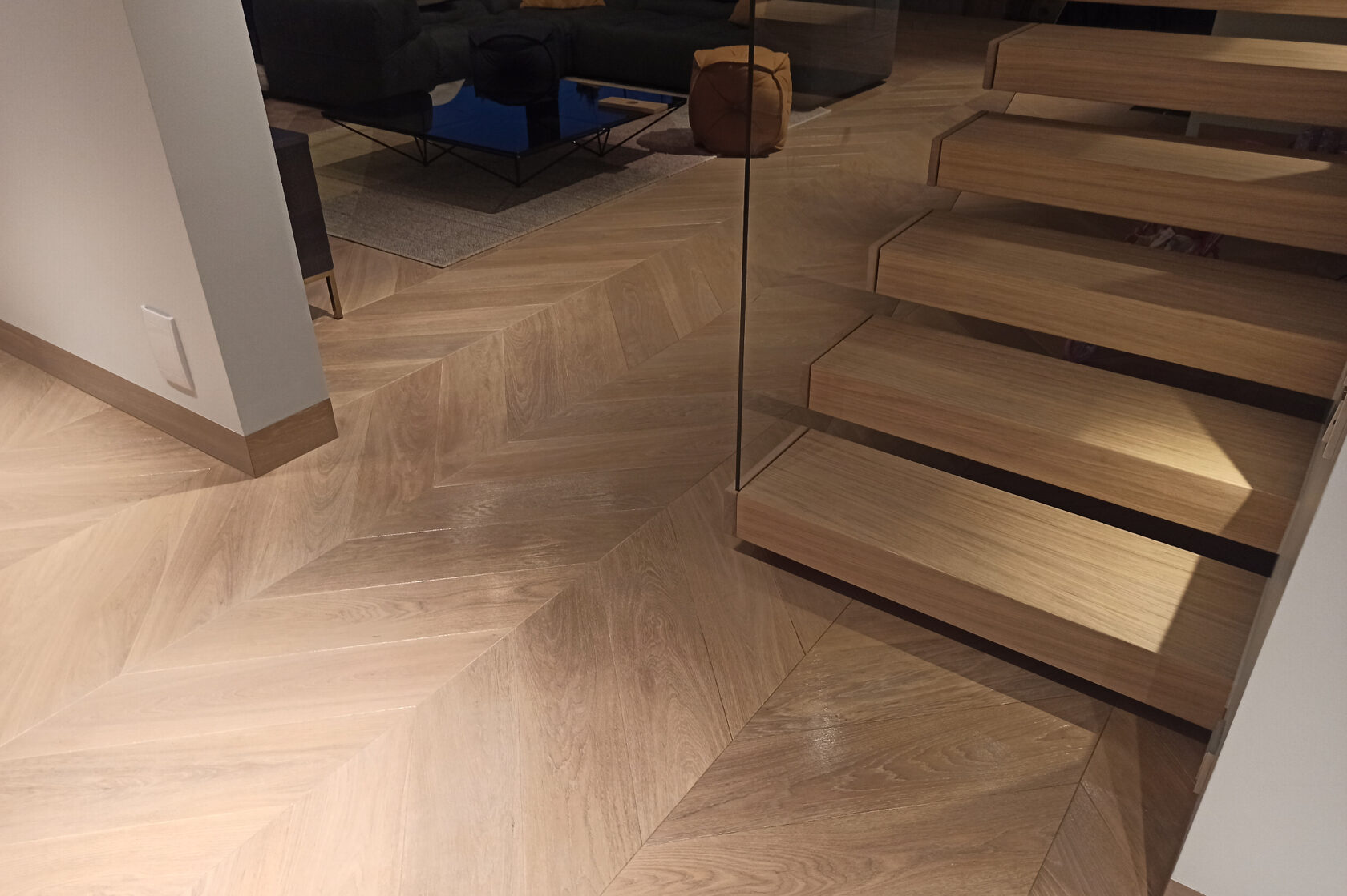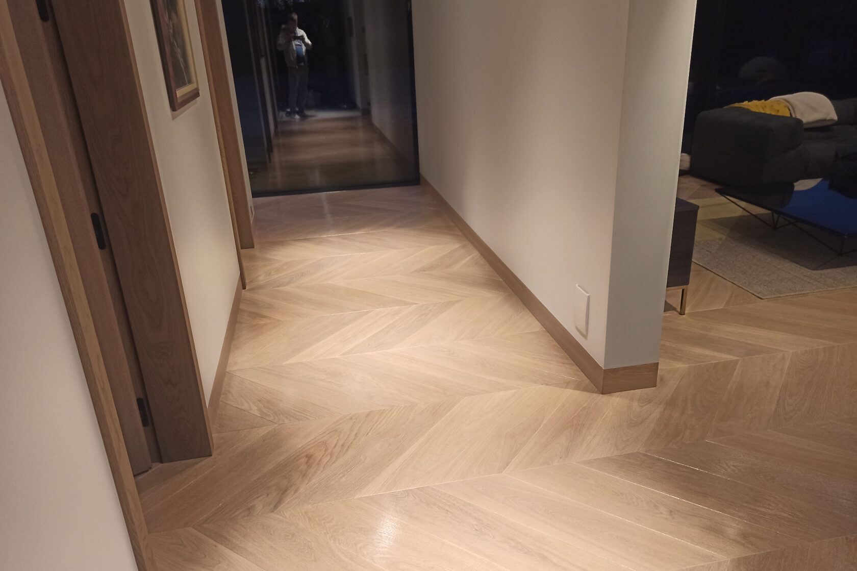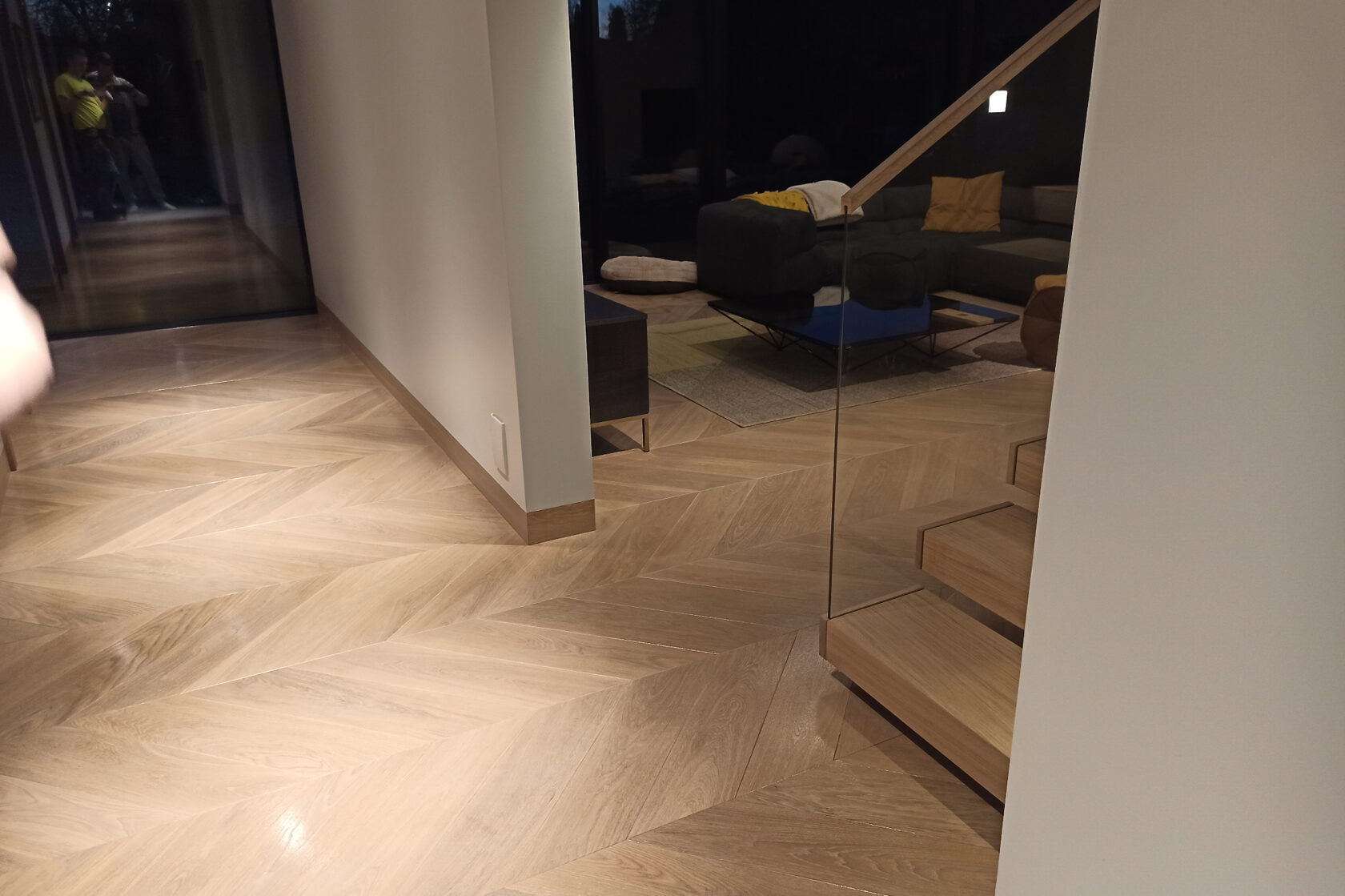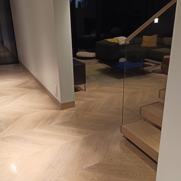 Tammelinna eramaja interjööris on paigaldatud elegantne prantsuse kalasaba mustriga tammeparkett, millele on antud „Kradi“ viimistlus – leelise ja valge õli kombinatsioon.