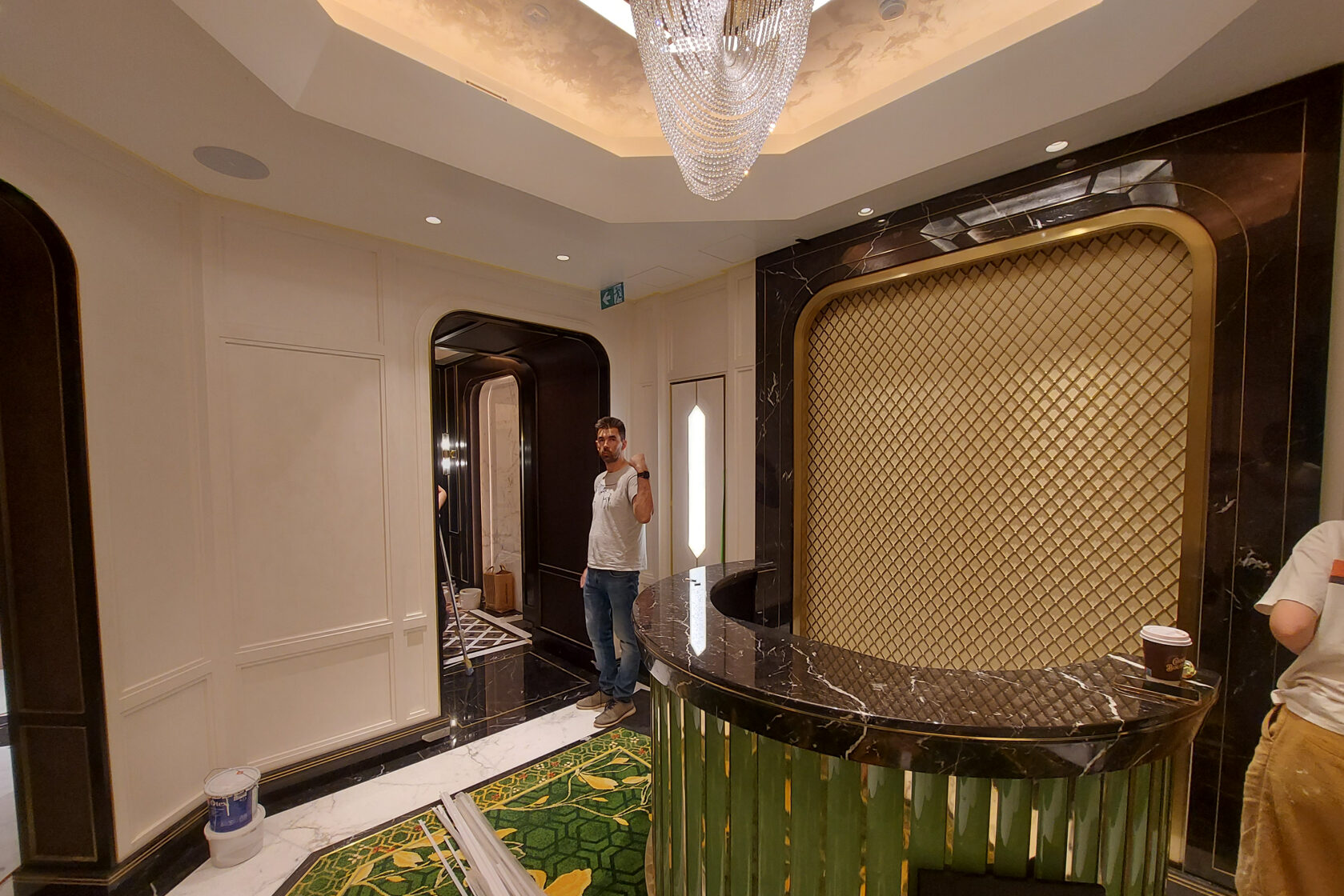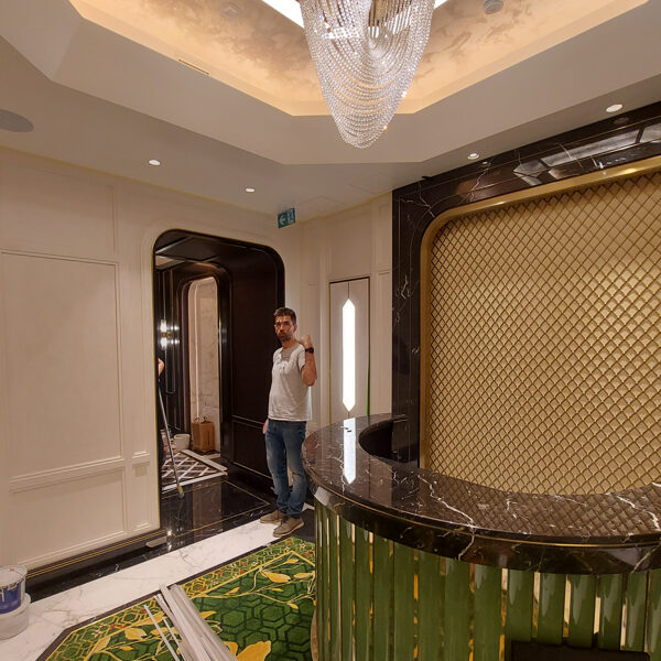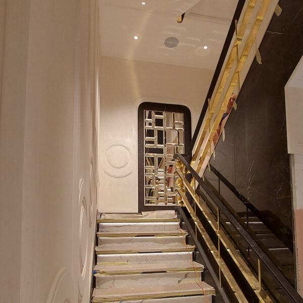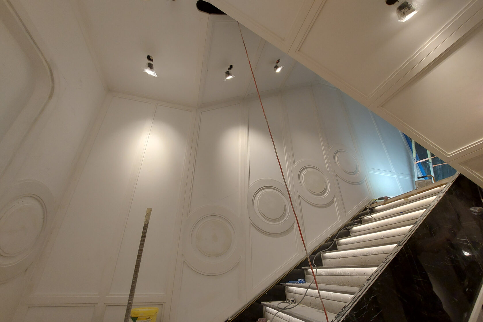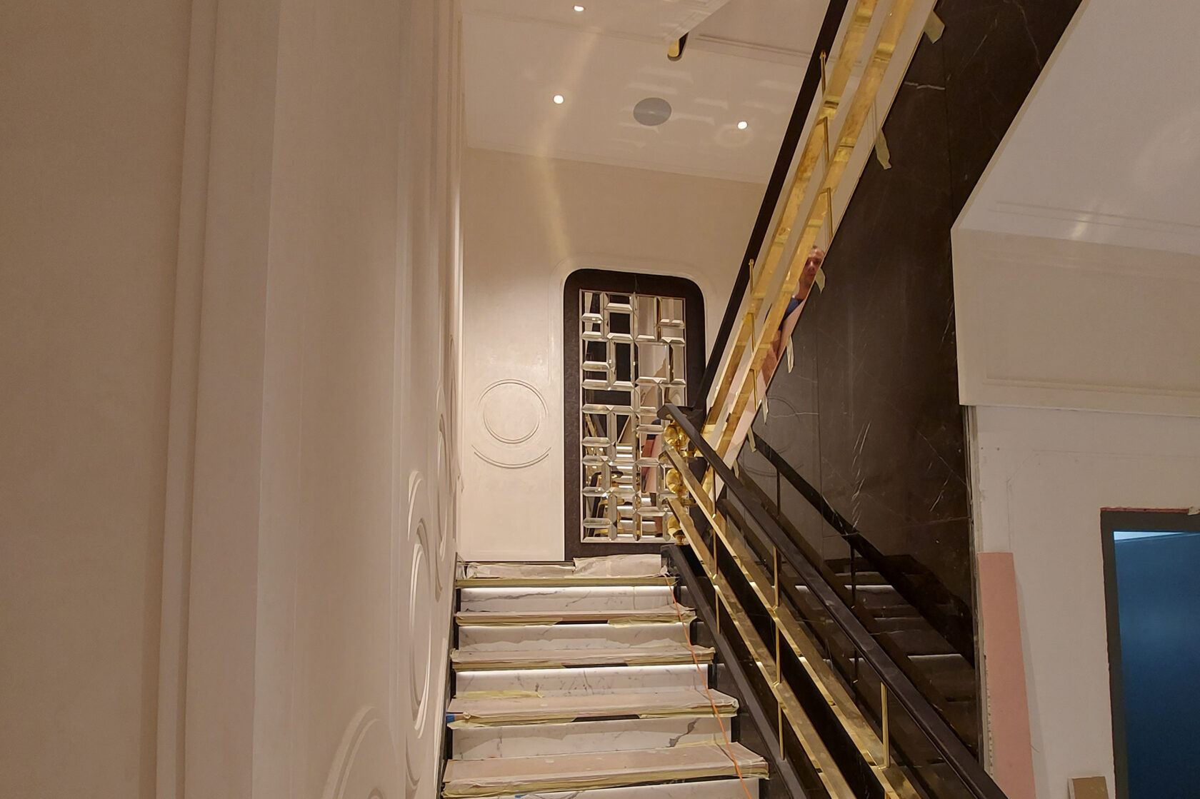 Bombay Kasiinos teostasime esindusliku trepikoja seina- ja laepaneelide lahenduse, mis ühendab luksusliku materjalikasutuse ning täpse teostuse. Paneelistus loob ruumi väärika ja harmoonilise atmosfääri, rõhutades interjööri modernset stiili ning kvaliteetset viimistlust.