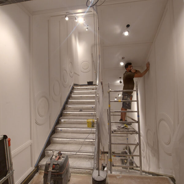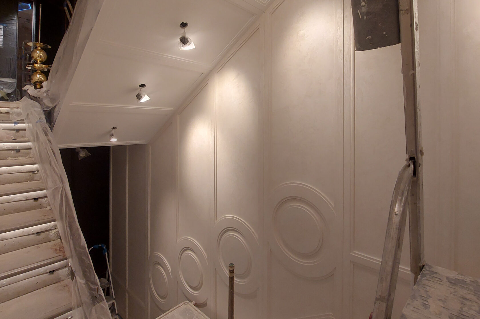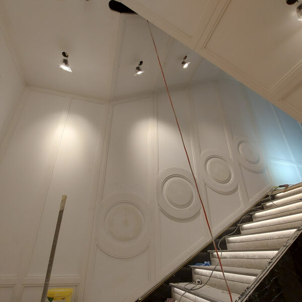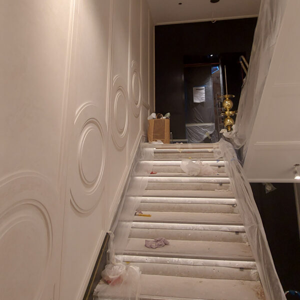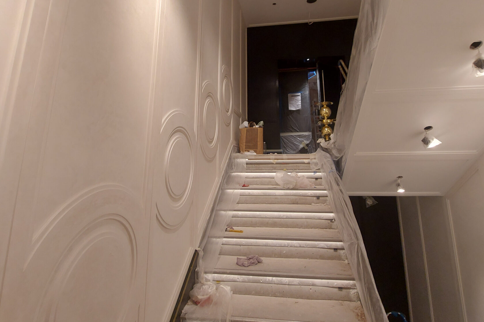 Lisaks paneelitöödele paigaldasime ka põrandakatteid, tagades kogu trepikoja viimistluse ühtse ja elegantse tervikuna. Projekti käigus viidi läbi ka aderdustööd, mis aitasid saavutada detailideni viimistletud lõpptulemuse.