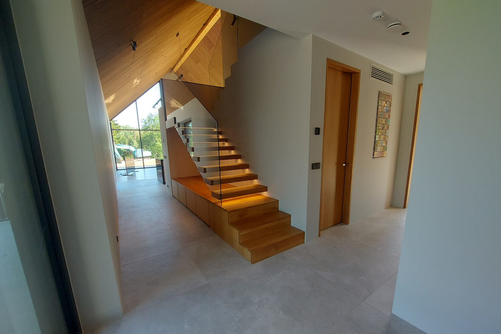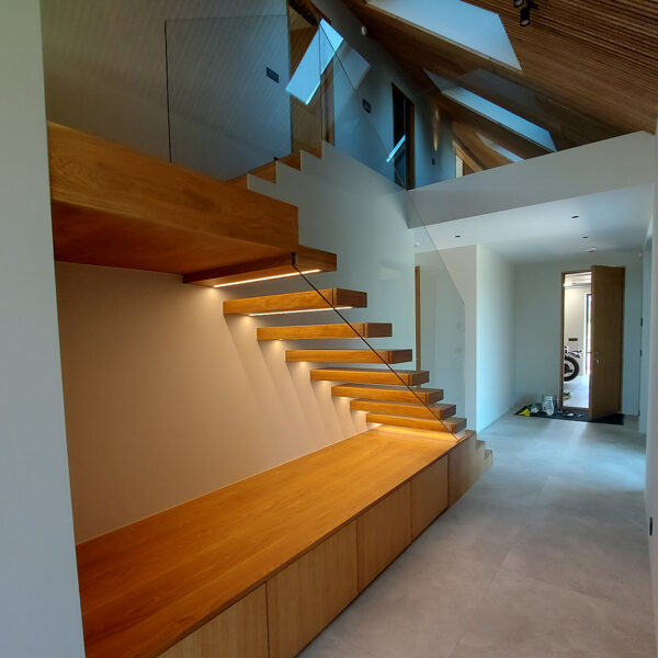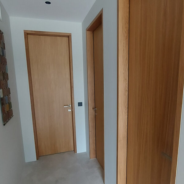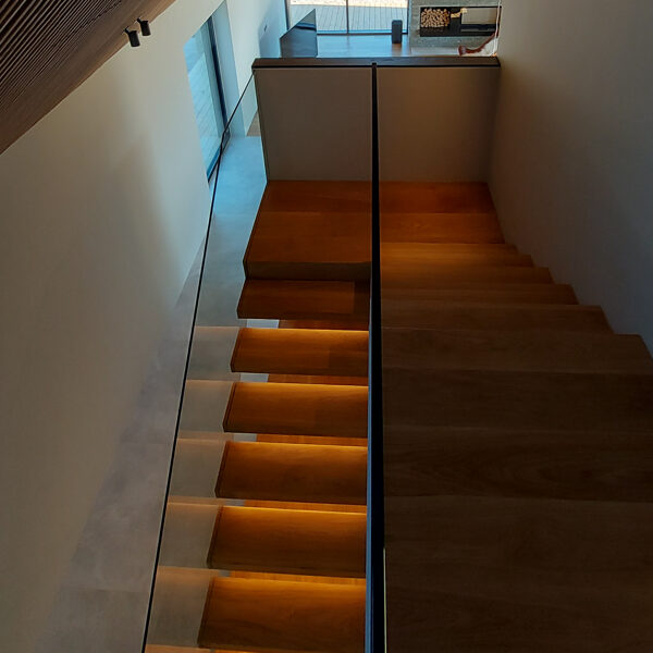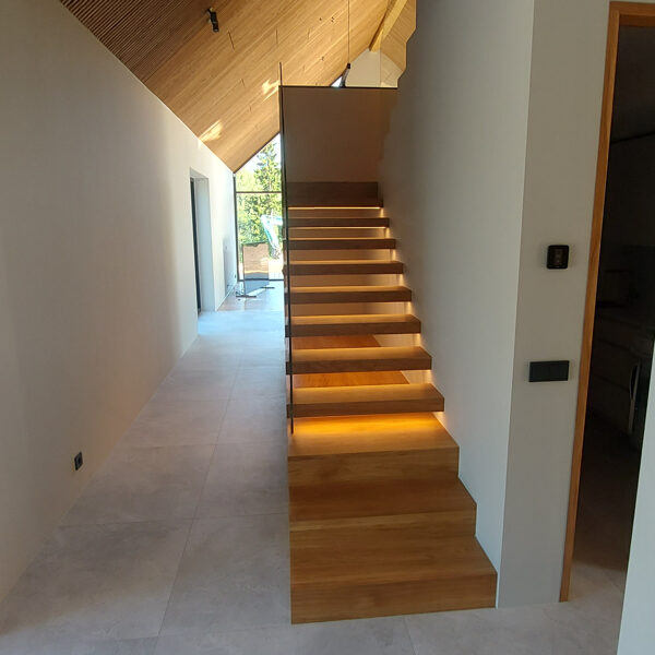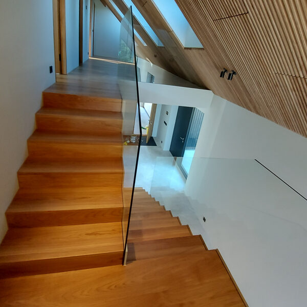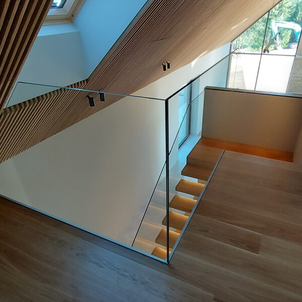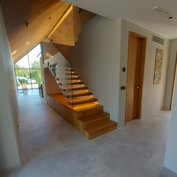 Tegemist on elegantse eramuga, mille sisekujunduse terviklahenduse loomisel panustasime mitmekülgselt. Tarnisime kõrgekvaliteedilise põrandamaterjali ning valmistasime tehasespooniga viimistletud parkettrepi, mis ühendab ruumid ühtseks ja stiilseks tervikuks. Lisaks tootsime samas viimistluses siseuksed, trepialuse funktsionaalse mööbli ning erilahendusliku klaasielemendi, mis lisab interjöörile avarust ja kaasaegsust.