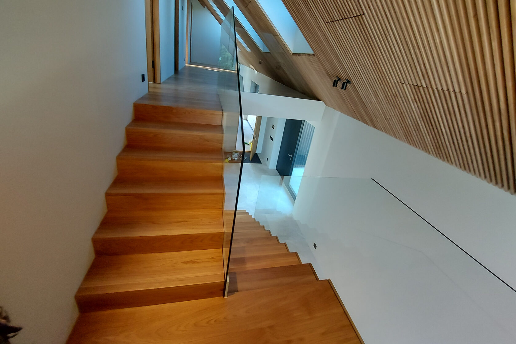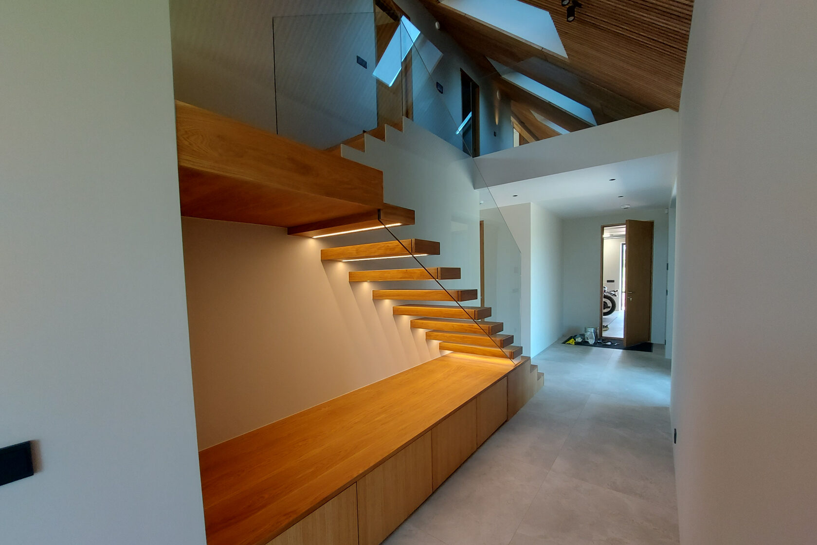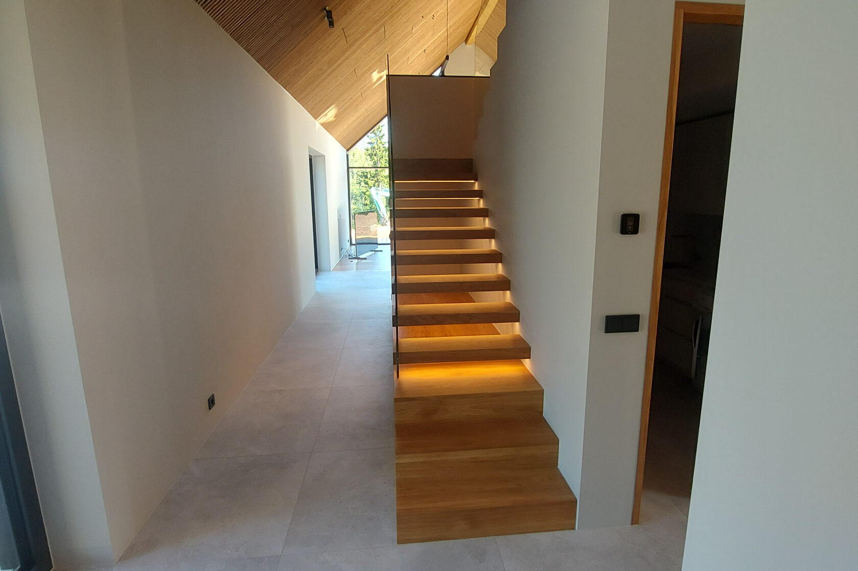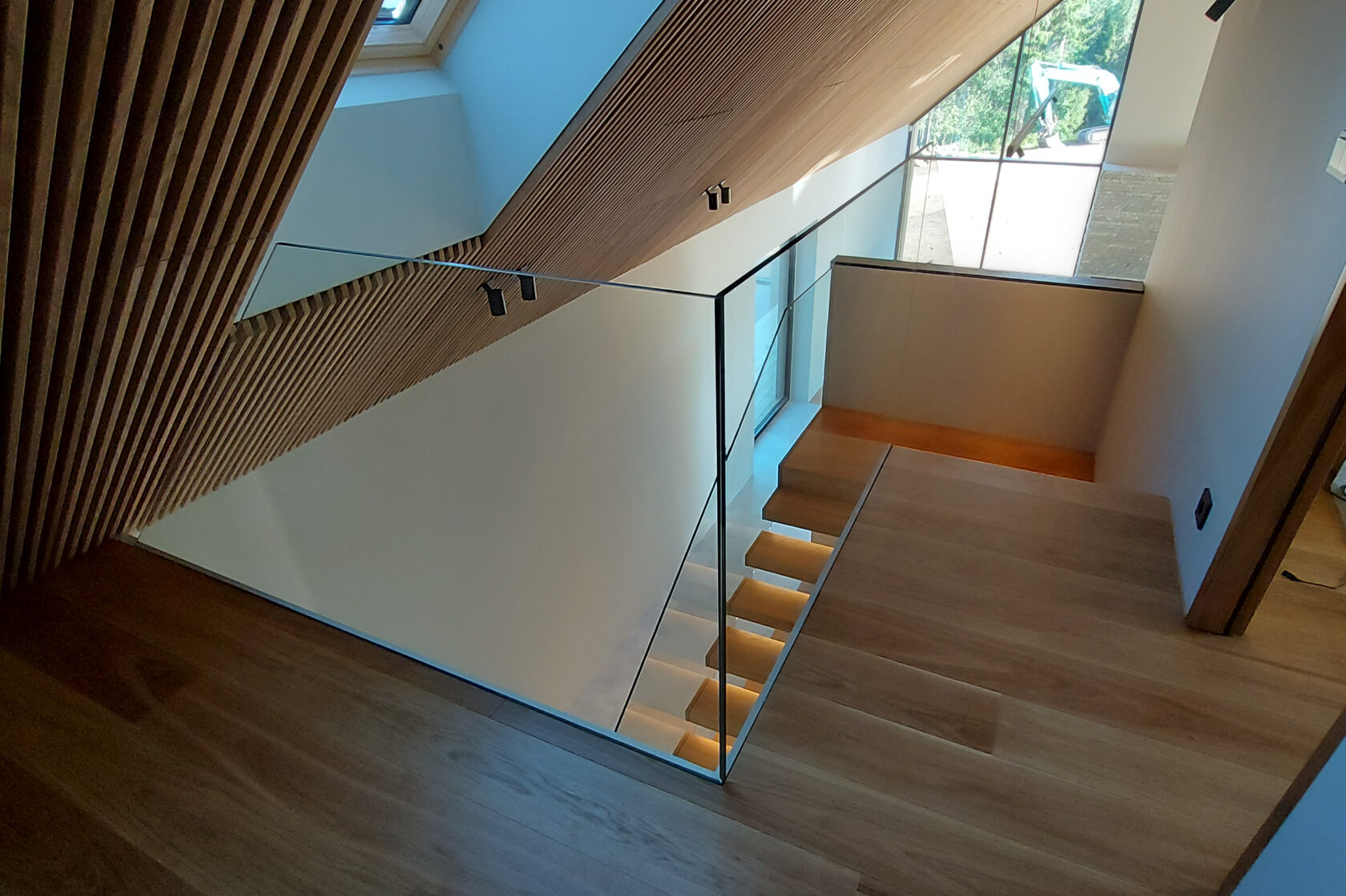 Tegemist on elegantse eramuga, mille sisekujunduse terviklahenduse loomisel panustasime mitmekülgselt. Tarnisime kõrgekvaliteedilise põrandamaterjali ning valmistasime tehasespooniga viimistletud parkettrepi, mis ühendab ruumid ühtseks ja stiilseks tervikuks. Lisaks tootsime samas viimistluses siseuksed, trepialuse funktsionaalse mööbli ning erilahendusliku klaasielemendi, mis lisab interjöörile avarust ja kaasaegsust.